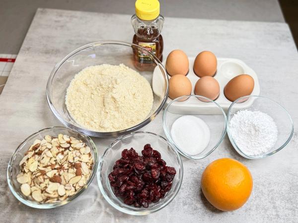 - In a large bowl, combine all the dry ingredients: almond flour, powdered sugar, salt, sugar, grated zest, and dried berries. Mix thoroughly until well combined and smooth