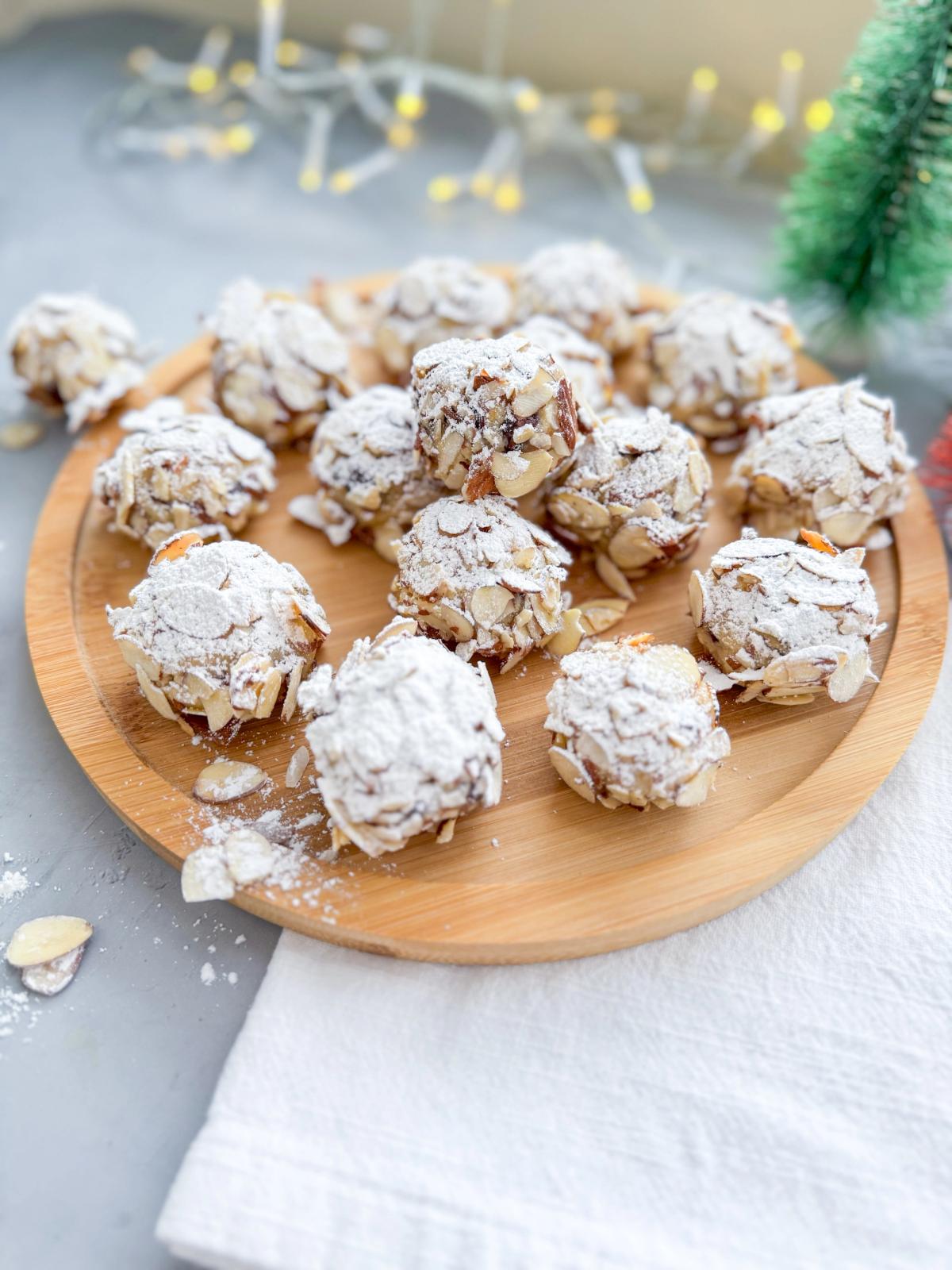 - With wet hands, form small balls of dough. Dip each ball into the beaten egg whites, then coat them in the almond flakes. Place the coated balls on a baking sheet lined with parchment paper