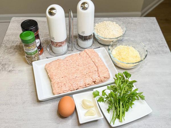 - In a large bowl, combine all the ingredients: ground meat, cheese, breadcrumbs, eggs, spices, and herbs