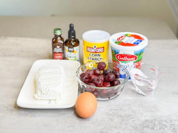 - In a medium bowl, use an immersion blender to mix all the ingredients—cheese, egg, starch, sweetener, and vanilla—until the mixture is completely smooth.
