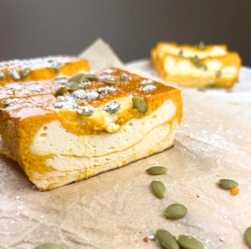 - Transfer this masses to the mold (metal, silicon). Spread the pumpkin and cheese masses alternately: a spoonful of cheese, a spoonful of pumpkin on top. And so we repeat until the end.