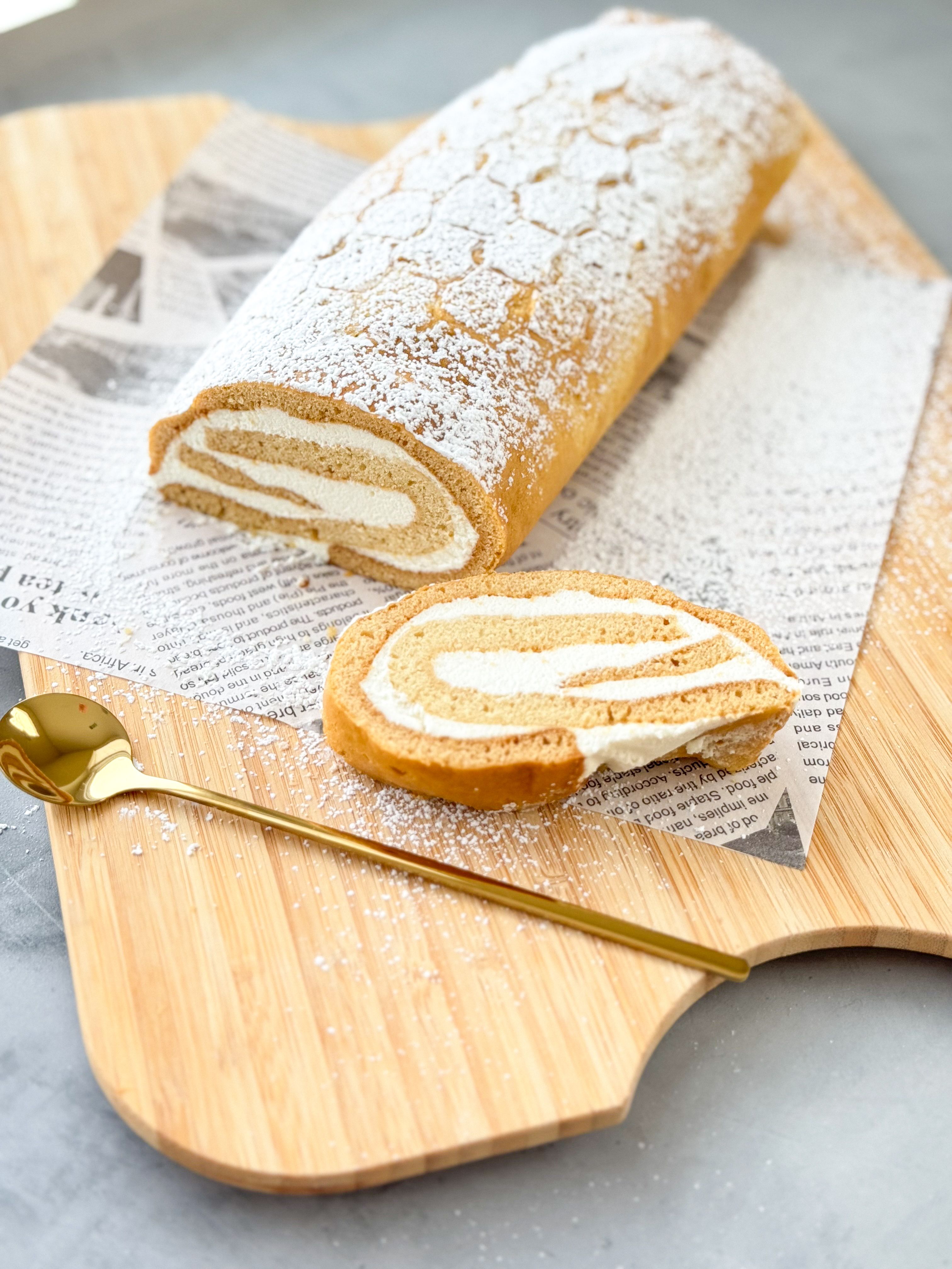 - Carefully roll the cake into a log using the parchment paper for support. Wrap it tightly in cling film or parchment and refrigerate for at least a few hours to set. Once chilled, trim the edges, sprinkle with powdered sugar if desired, and slice into pieces. Serve with your favorite drink and enjoy!
