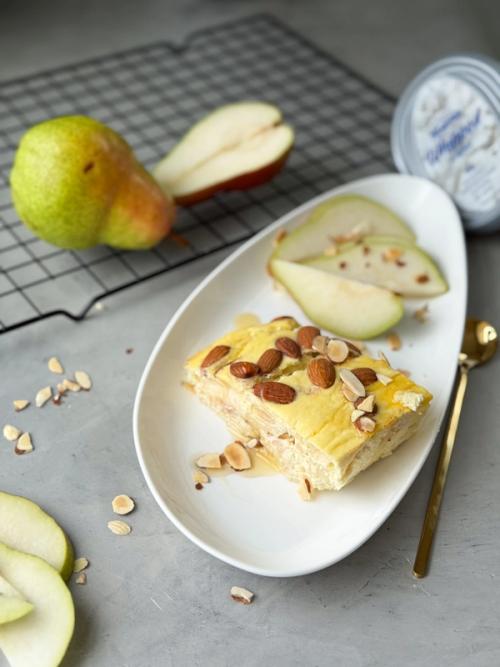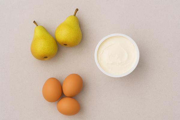 - Combine the pears with the cream mixture and gently fold them together. Pour everything into a baking dish, sprinkle with sliced nuts if desired, and bake in a preheated oven at 350°F (180°C) for 30–40 minutes.