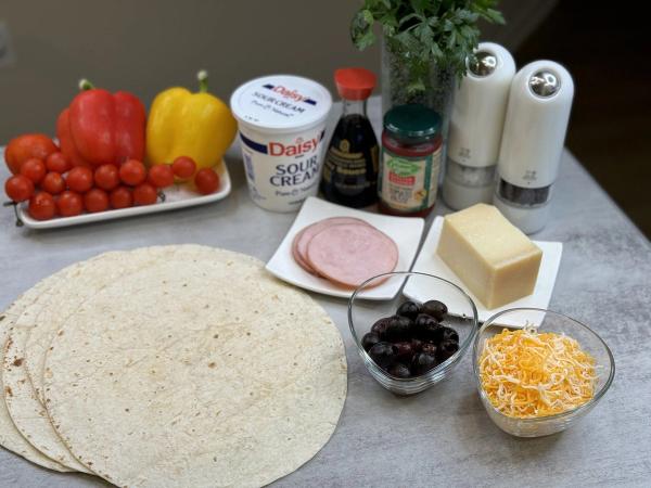 - Place the second tortilla on top, spread sauce on it, and then add all the chopped ingredients