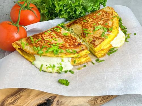 - Сover the top with a tortilla and cook for 5-7 min on low heat until the omelette is ready and the cheese melts