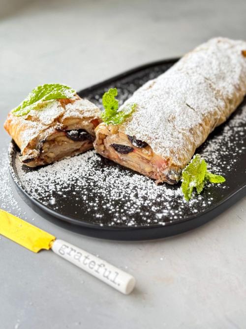 - По готовності штруделя, дай трішки охолонути. За бажанням, присип цукповою пудрою та подавай навіть гарячим...із кулькою холодного морозива та лисочками мʼяти ...ммм ідеально!