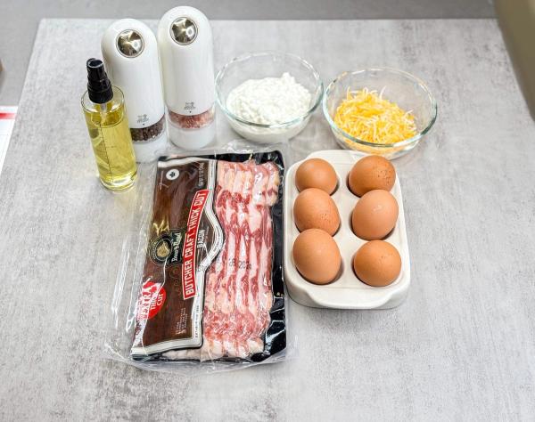 - деко для мафінів змасти олією. Виклади бекон та натертий твердий сир на дно кожної ємності. Зверху залий яєчною масою (не до самого краю)