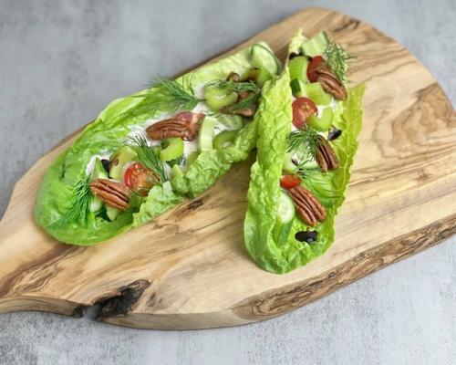 - Викладаємо начинку порційно на кожен листок, додаємо зверху порізані овочі