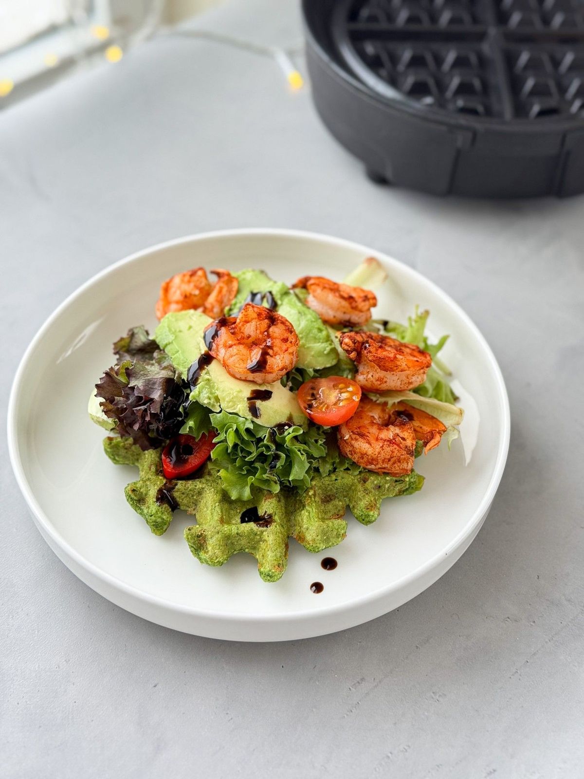 - Дай трішки охолонути, а далі - змасти вафлю вершковим сиром, виклади слабосолений лосось чи готові креветки, зелень, авокадо, насіння. Полий красиво бальзамічним соусом і поживний сніданок готовий!