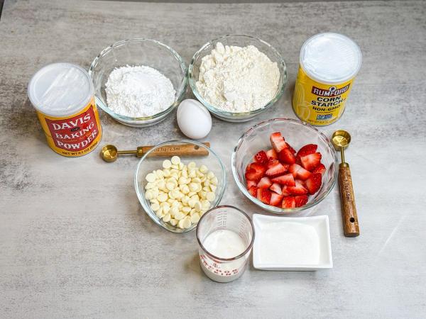 - Наріж дрібно полуницю, висип її в ківш та додай решту інгредієнтів: цукор, крохмаль, воду